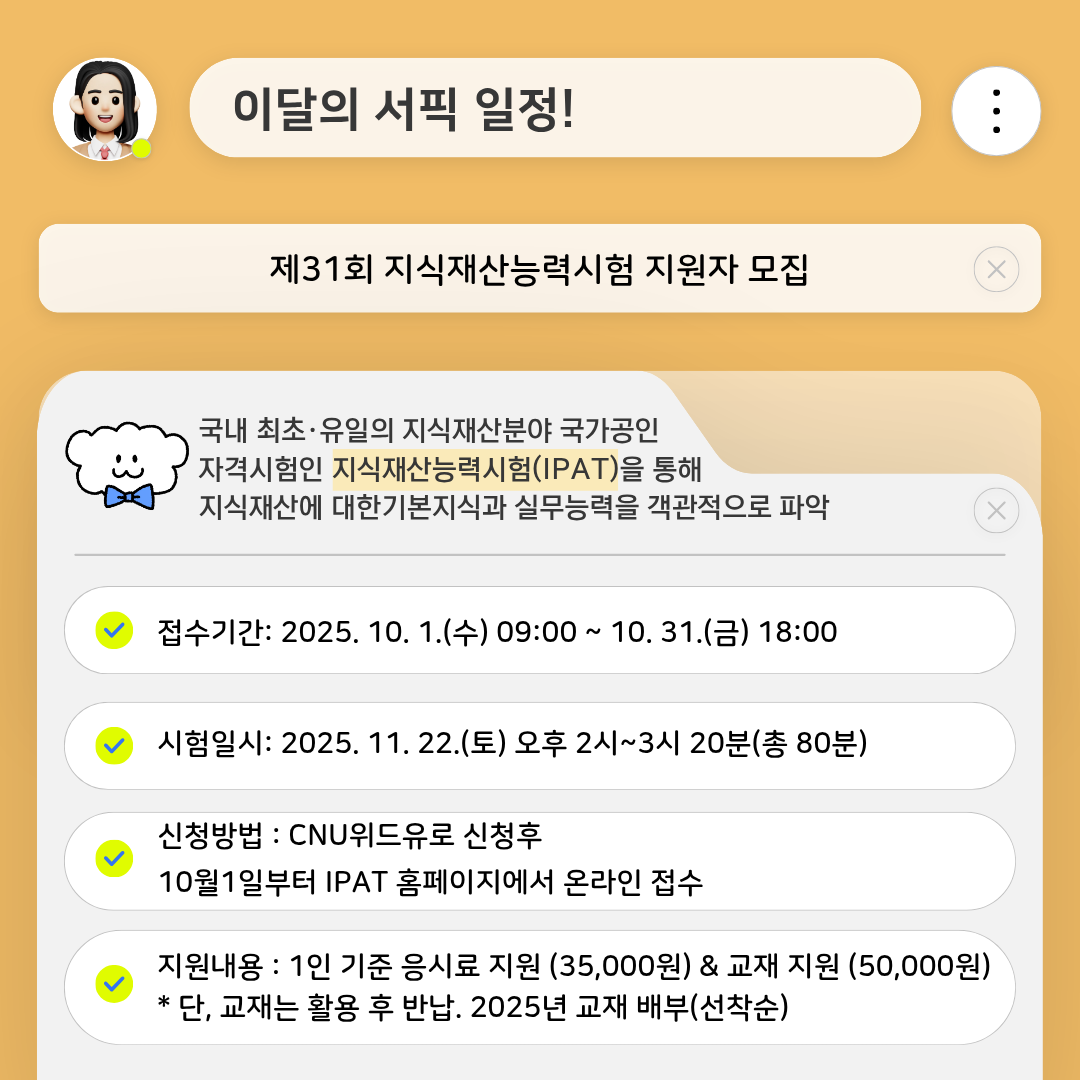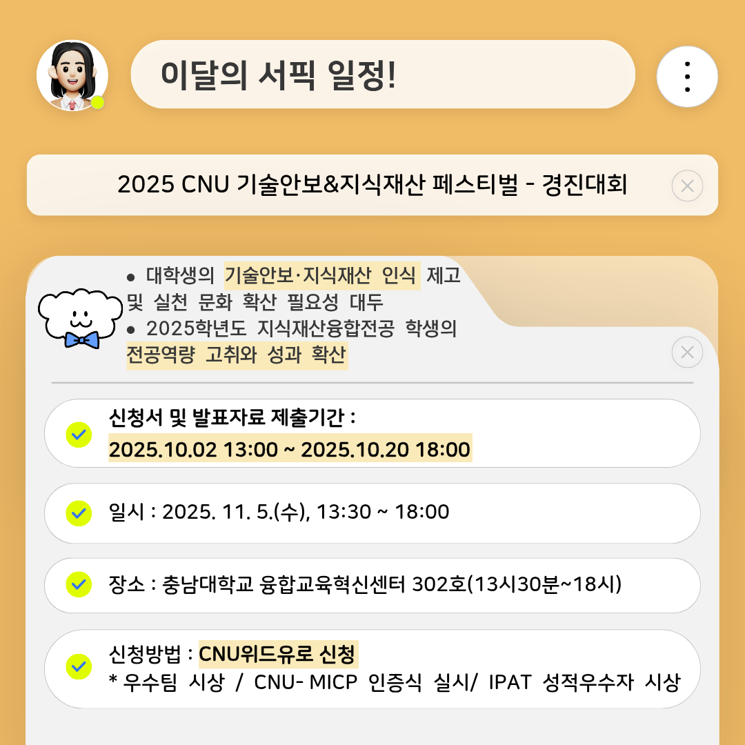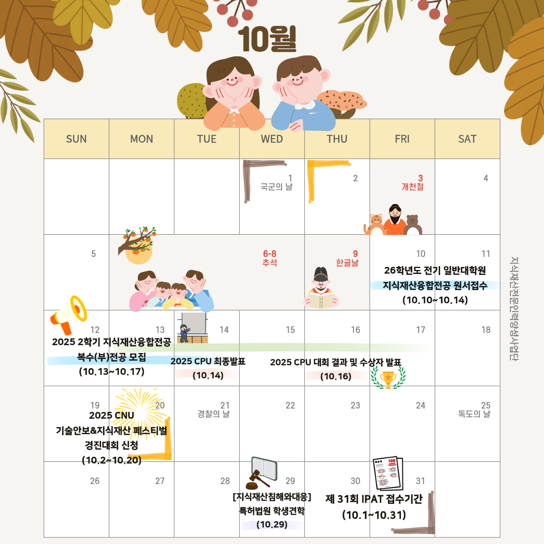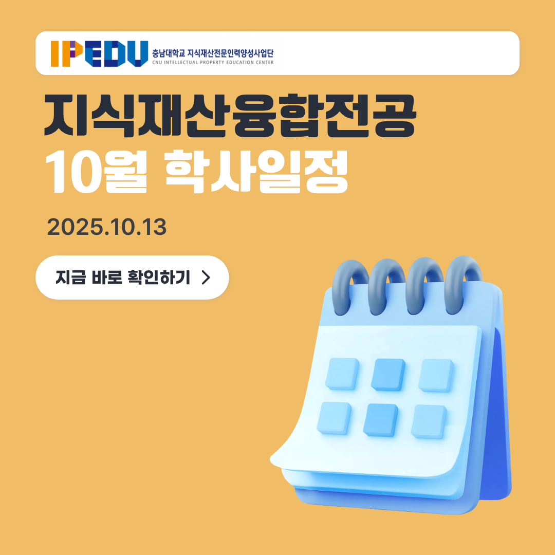 CNU 지식재산융합전공 10월 핵심만! 캘린더 체크! 안녕하세요! 지식재산융합전공입니다. 10월 주요 일정 놓치지 말고 꼭 확인하세요! 1. 복수/부전공 모집 기간: 10.13.(월) ~ 10.17.(금) 2. IPAT (지식재산능력시험) 접수 기간: ~ 10.31.(금) 18:00까지 응시료 및 교재 지원! 3. 경진대회 신청 마감 행사명: CNU 기술안보&지식재산 페스티벌 마감: ~ 10.20.(월) 18:00까지 #충남대 #지식재산융합전공 #IPEDU #10월일정 #IPAT #복수전공 #지식재산 |
