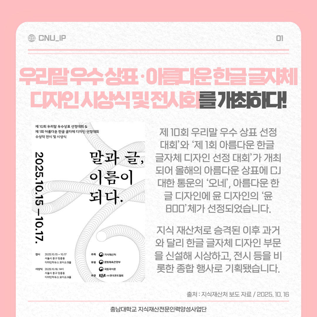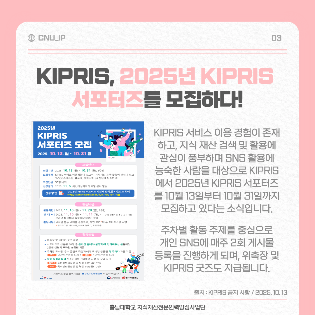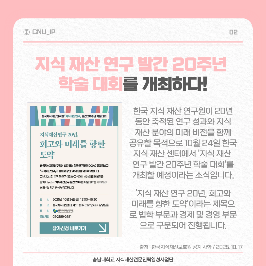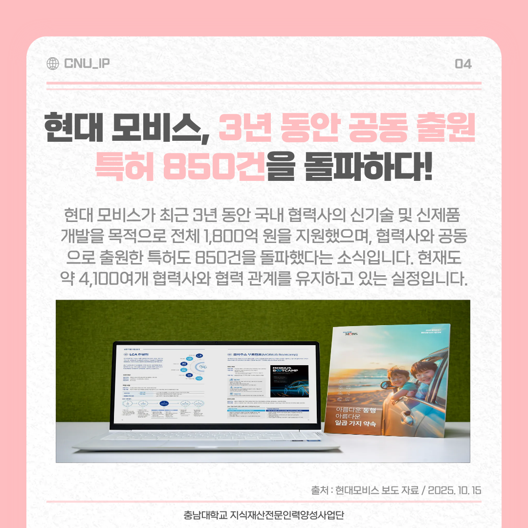 안녕하세요, 충남대학교 지식재산융합전공입니다! 지식 재산 부문의 최신 소식을 한눈에 정리한 ‘지식 재산 NEWS LETTER’는 매주 금요일에 발행됩니다. 많은 관심 부탁드립니다. 감사합니다! * 자료 출처 : 지식재산처 보도 자료 / 한국지식재산보호원 공지 사항 / KIPRIS 공지 사항 / 현대 모비스 보도 자료 |